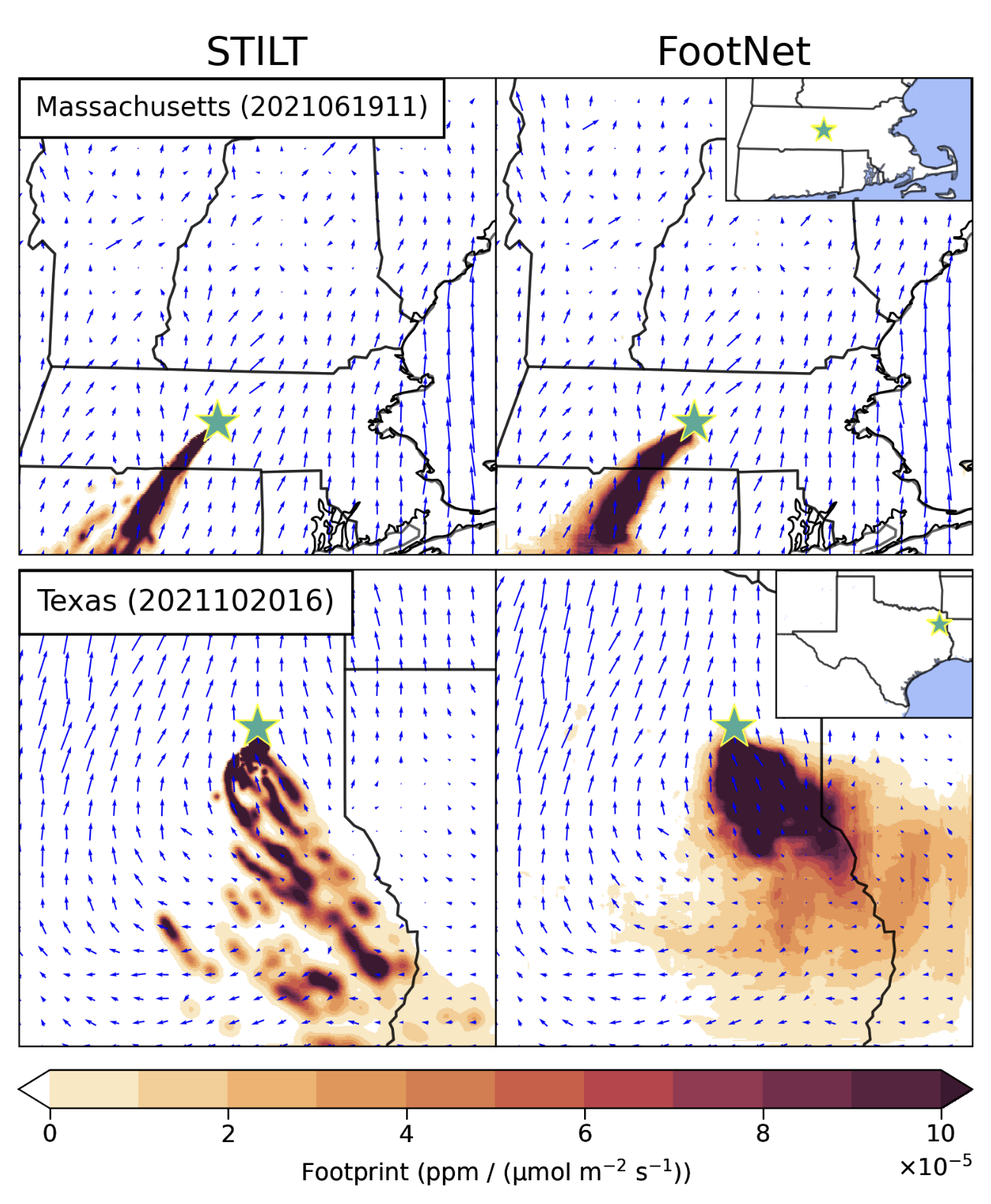 FootNet is a physics-guided deep learning model that can emulate atmospheric transport. It is trained on half a million examples generated using a physics-based model (STILT). It is 1000x faster than STILT and can compute footprints on-the-fly.